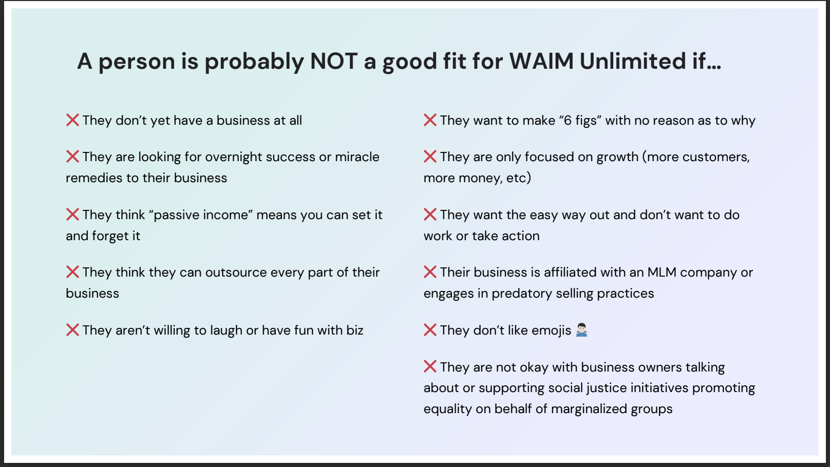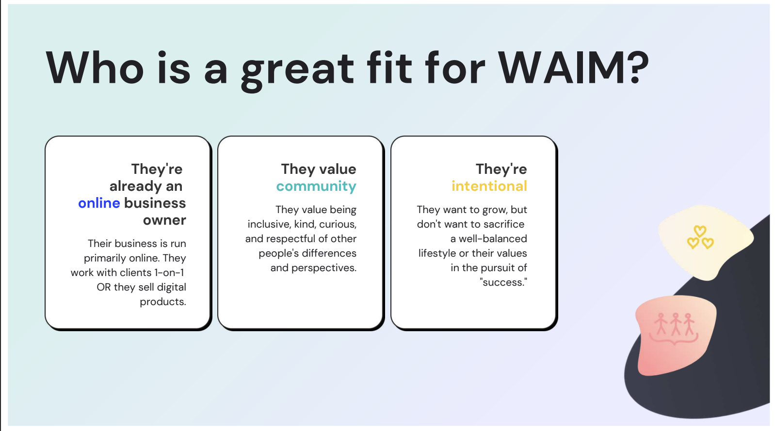 WAIM is a program called Wandering Aimfully, which is an (un-boring) business coaching program for intentional online business owners. The creators have evolved WAIM into WAIM Unlimited - Past, Present & Future edition.